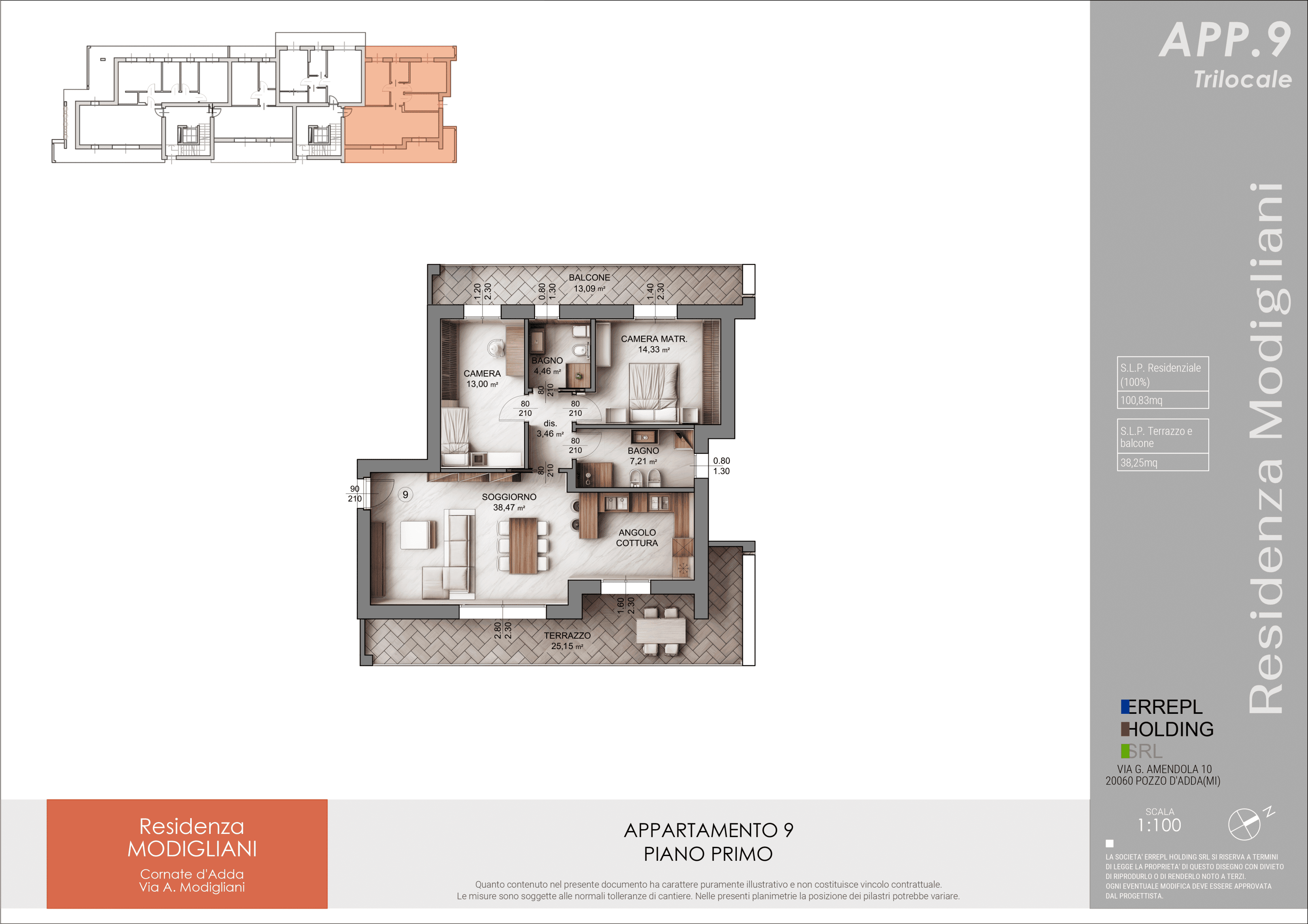 Composto da 11 appartamenti di differenti tagli e metrature, con terrazzi o giardini privati, si sviluppa su tre piani fuori terra ed uno interrato adibito ad autorimessa.